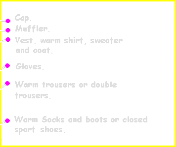It is very important to take warm clothes with you: In order not to get cold, I recommend to use warm clothes according to the following recommendations, they might seem exaggerated, but it is better to take too much warm clothes and possibly not to need them, as to get too cold without needing to. |